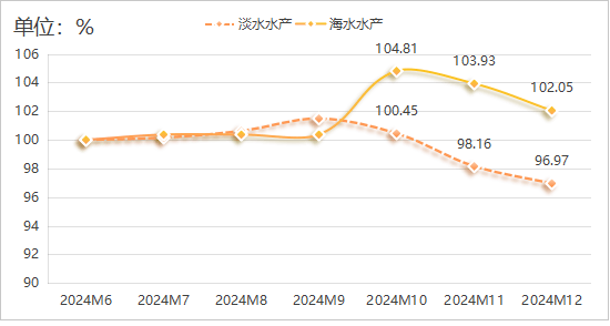 分项产物价钱指数方面,淡水水产取海水水产价钱指数均呈下行趋向,12月指数值别离为96。97点和102。05点,环比下降1。21%和1。81%,分项指数具体走势见下图。